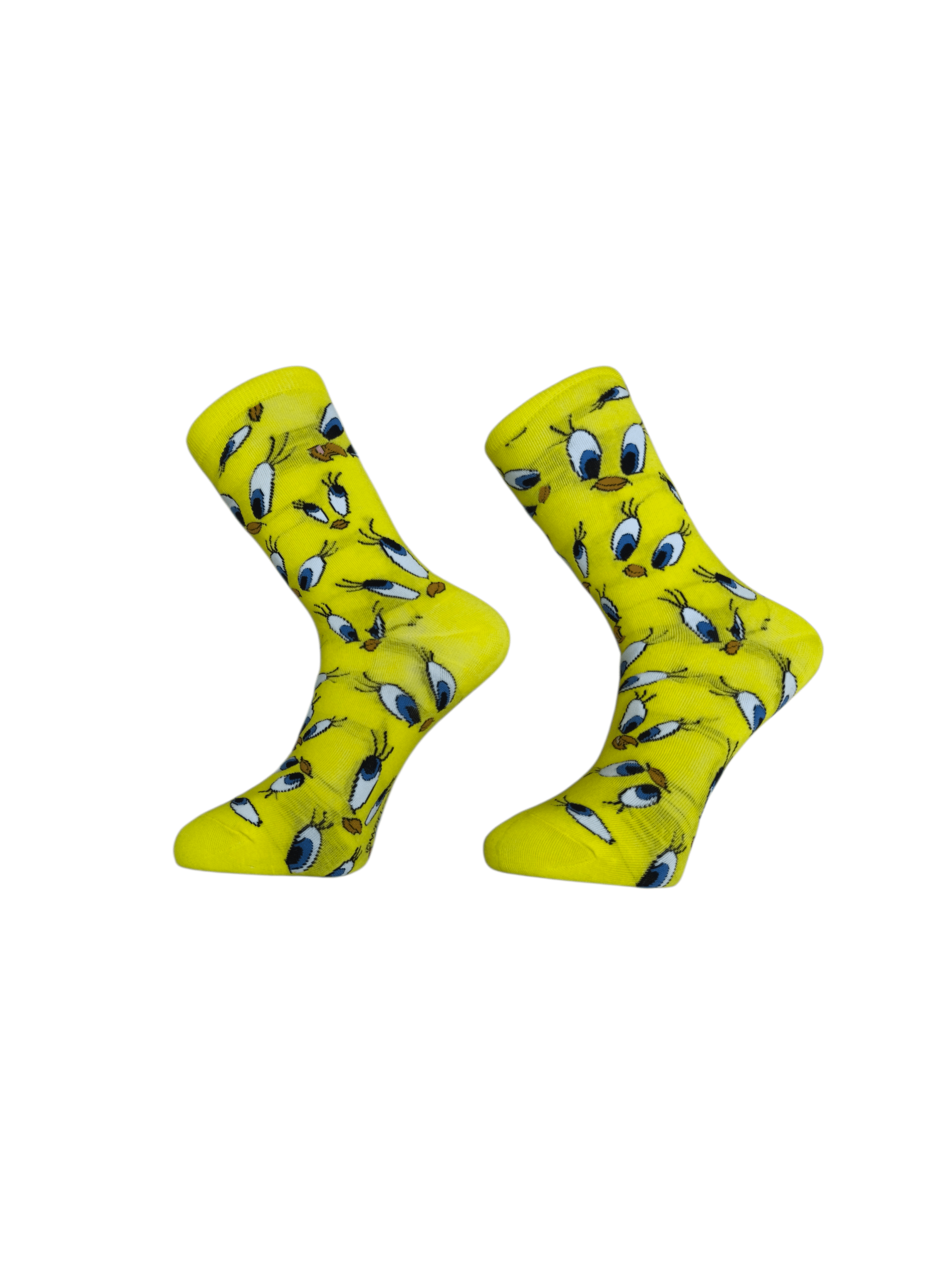 גרביים טוויטי צהובות עיניים כחולות מביאים לכם את הקסם של לוני טונס היישר אל ארון הבגדים. אתם בוודאי זוכרים את הציפור הקטנה והחכמה מהסדרות המצוירות. לכן המוצר הזה הוא הבחירה המדויקת עבור חובבי נוסטלגיה. ראשית העיצוב מתמקד בצבע צהוב בוהק ומלא חיים. הצבע הזה מעניק מראה שמח ובולט בכל בוקר מחדש. בנוסף לכך פניו של טוויטי מקשטים את כל שטח הגרב. האיורים מציגים את המבט המפורסם שלו עם העיניים הגדולות והריסים הארוכים. מסיבה זו כל צעד שלכם הופך לחגיגה צבעונית ומשעשעת. הגרביים האלו מוסיפים המון אופי לכל סגנון לבוש שתבחרו לעצמכם.