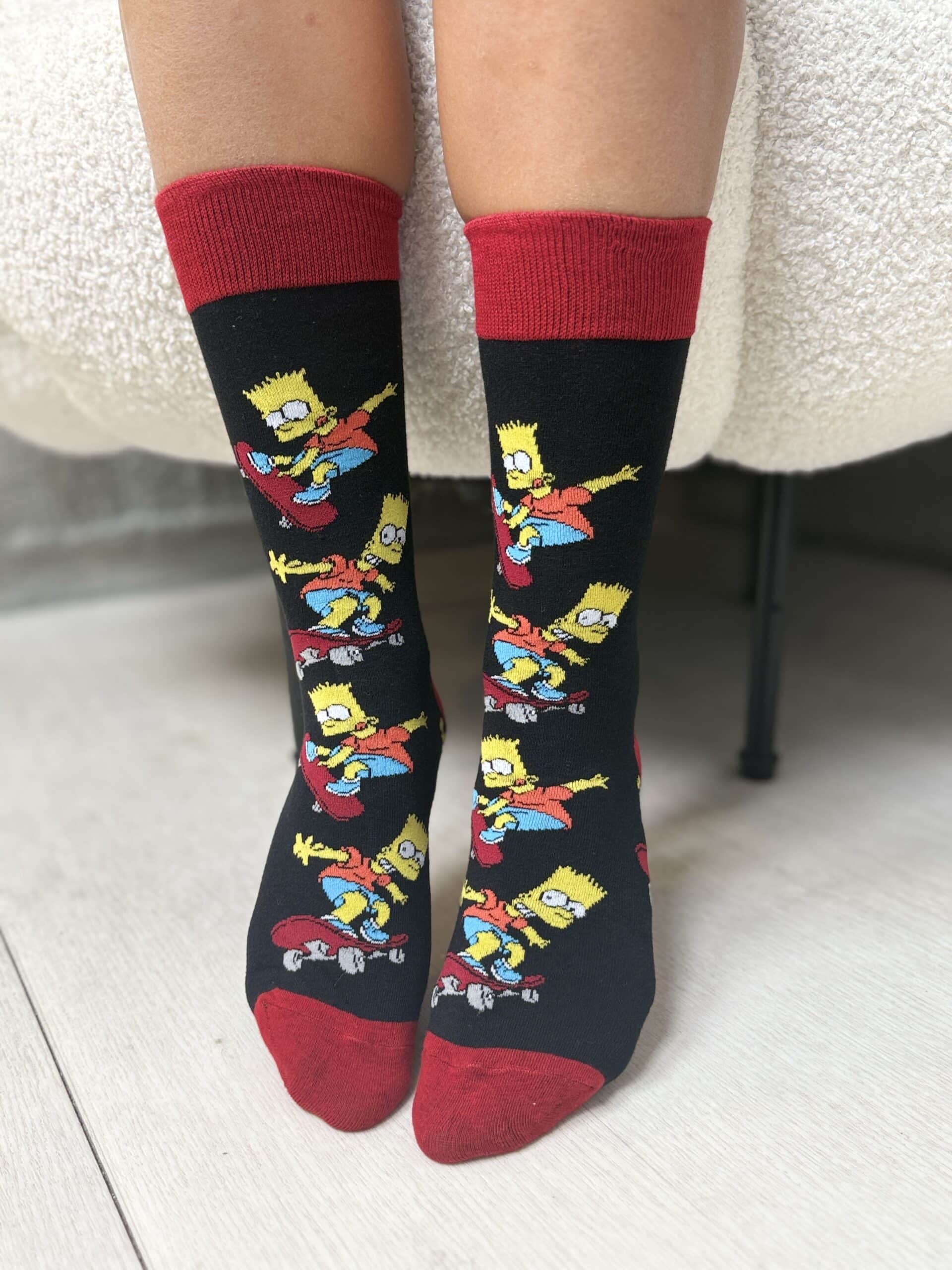 גרביים בארט סימפסון שחור אדום מעניקים לכם הזדמנות להוסיף המון אנרגיה שובבה למלתחה האישית. אם אתם מעריצים את הילד המורד של משפחת סימפסון המוצר הזה מושלם עבורכם. העיצוב מתבסס על רקע שחור דומיננטי שיוצר מראה נקי ומודרני לכל הופעה. דמותו של בארט סימפסון מופיעה לאורך כל שטח הגרב באיורים קטנים ומלאי תנועה. הוא נראה רוכב על הסקייטבורד האדום שלו בתנוחות אקסטרים שונות ומשעשעות. שילבנו צבע אדום עז ובולט באזור המכפלת העליונה ובקצות האצבעות של הגרב. השילוב בין השחור לאדום יוצר ניגודיות חזקה שמתאימה לכל סוג של נעלי סניקרס. הגרביים האלו מוסיפים נגיעה של חוצפה חיובית וסטייל לכל בגד שתבחרו בכל בוקר.
