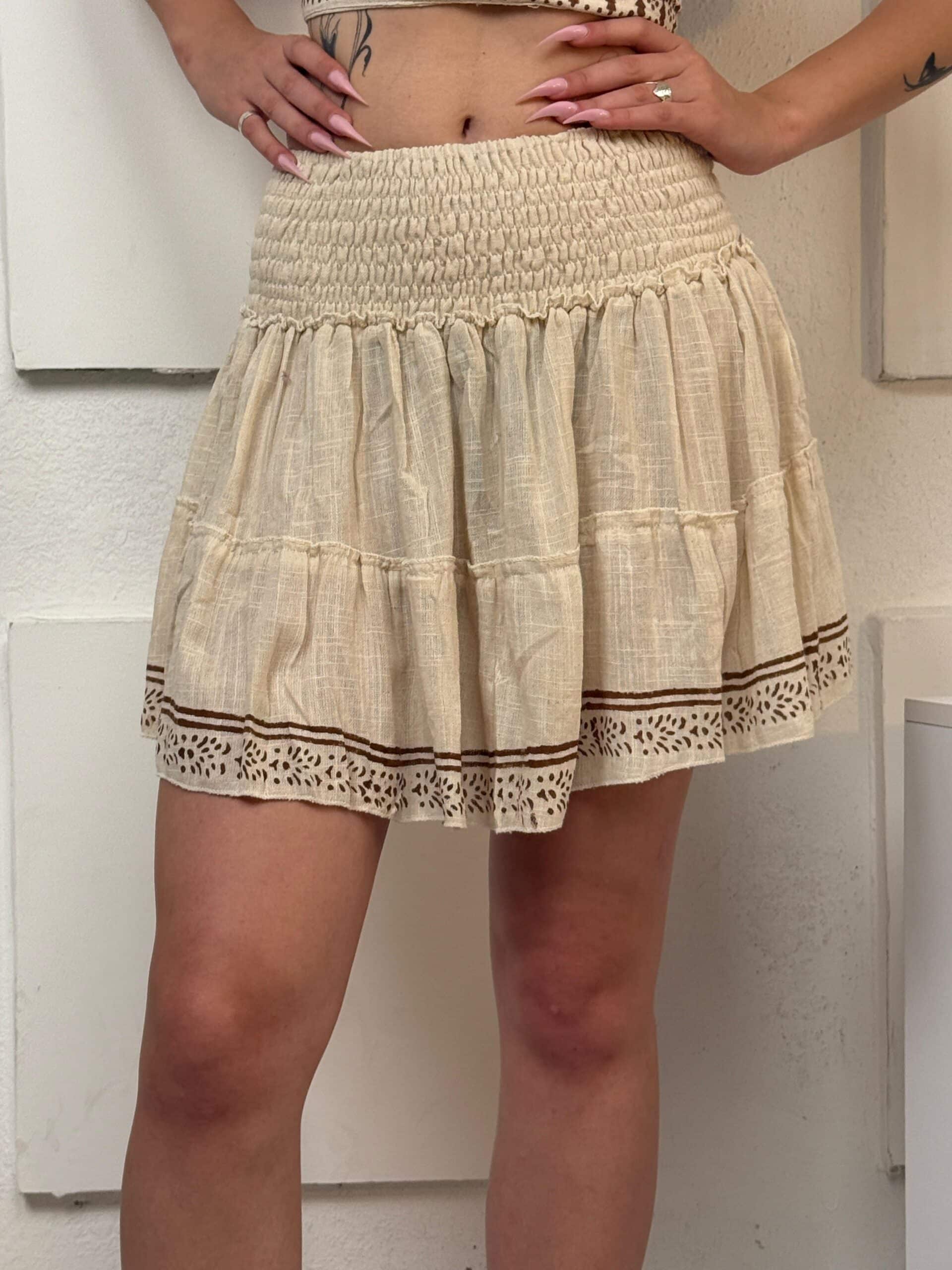 חצאית מיני בגזרה מתנפנפת שתזרום איתך בקלילות לאן שרק תלכי. גומי עבה במותן לנוחות מקסימלית ועיטורים אוריינטליים עם טאצ' בוהו. חצאית עם אנרגיות מתפרצות ו-וויב של קיץ קסום, ללבוש ולרקוד בלי הפסקה לצלילי טראנס, למבדה או צ׳ה צ׳ה, מה שמתחשק לך ❤️